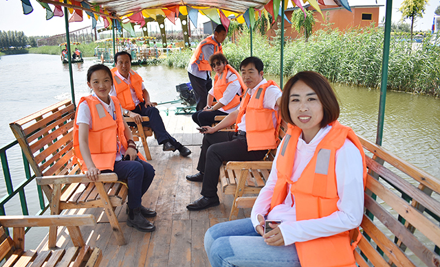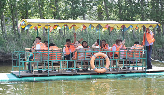 随后,全体党员在辽金时代观光园导游的带领下,乘坐竹筏游览辽金护城河,品尝辽金时代观光园的特色美食。